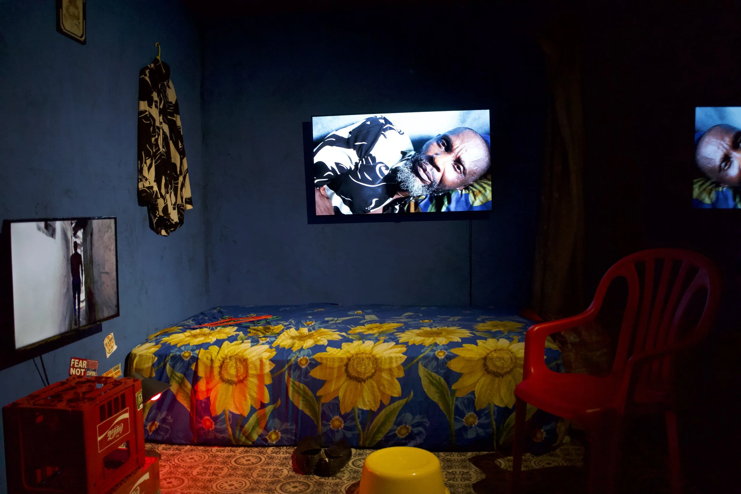 The work consists of two large vitrines in which the bedrooms of two masqueraders are conjured, becoming an encounter with their inner worlds. The bedrooms belong to veteran urban masqueraders Neenukuu Kpogah (green room) and Nicholas Kuapie (blue room). Both live in the slum community of Ibadan Waterside in Port Harcourt. Neenukuu is a drummer, dancer and youth leader, and works as a security guard. Nicholas, a tall, slim and well-dressed 44-year-old, works as a driver for a wealthy Port Harcourt entrepreneur. Both are members of a Port Harcourt troupe named Gwara Cultural Dance Group. Their motto is the cry ‘One Love!’ to which the group responds ‘Keep Us Together’. Each room is a near replica of their respective bedrooms. The sheets, shirts, shoes and artefacts that appear in the videos were gifted to the artist to furnish the installation. But these are not just bedrooms, they are ‘heartscapes’, a reflection on power, poverty, strength and vulnerability.