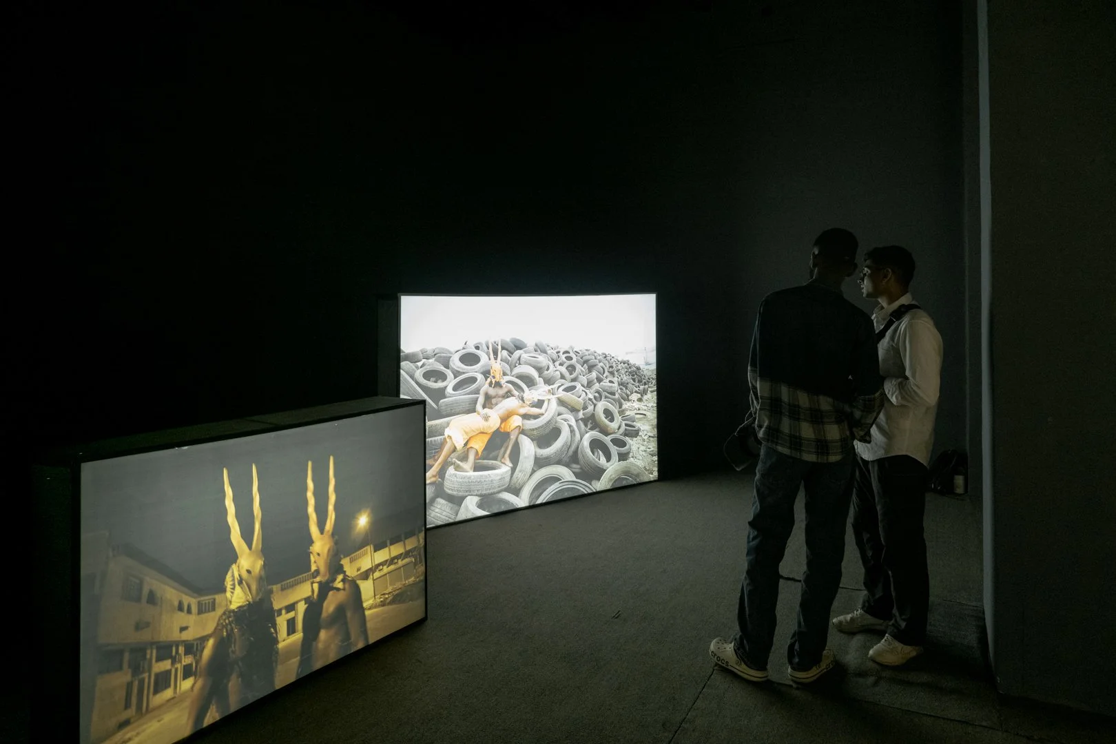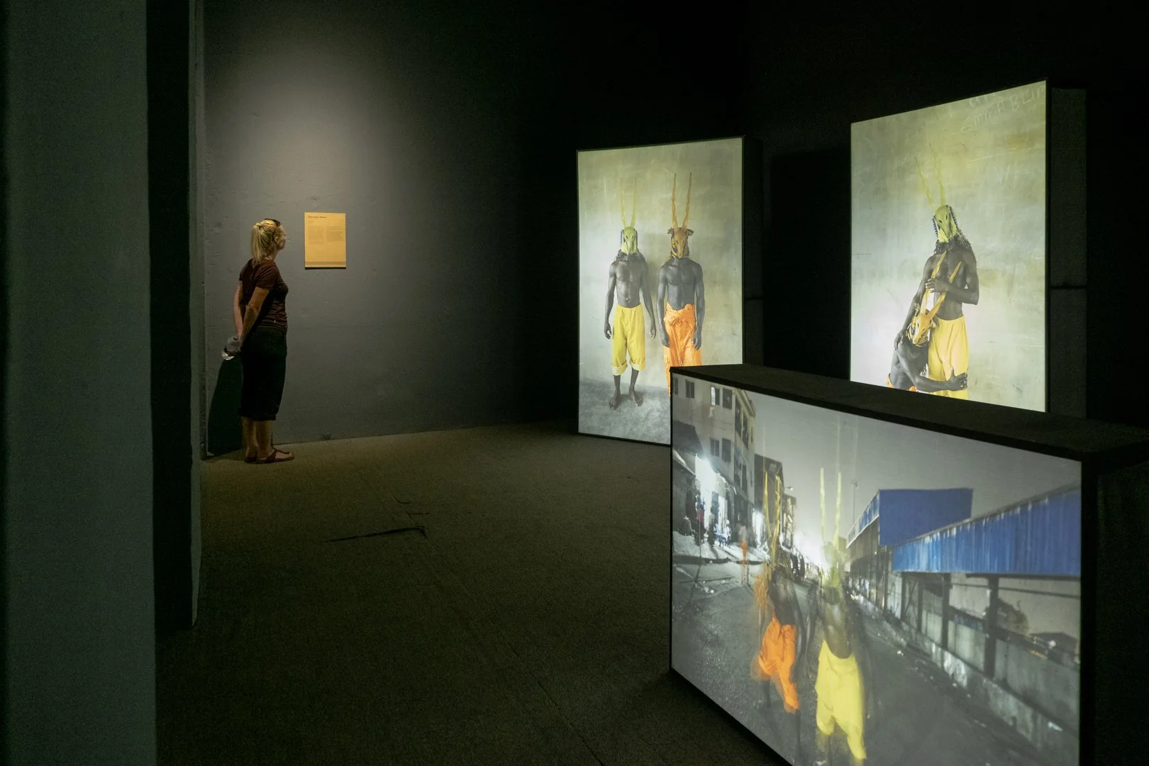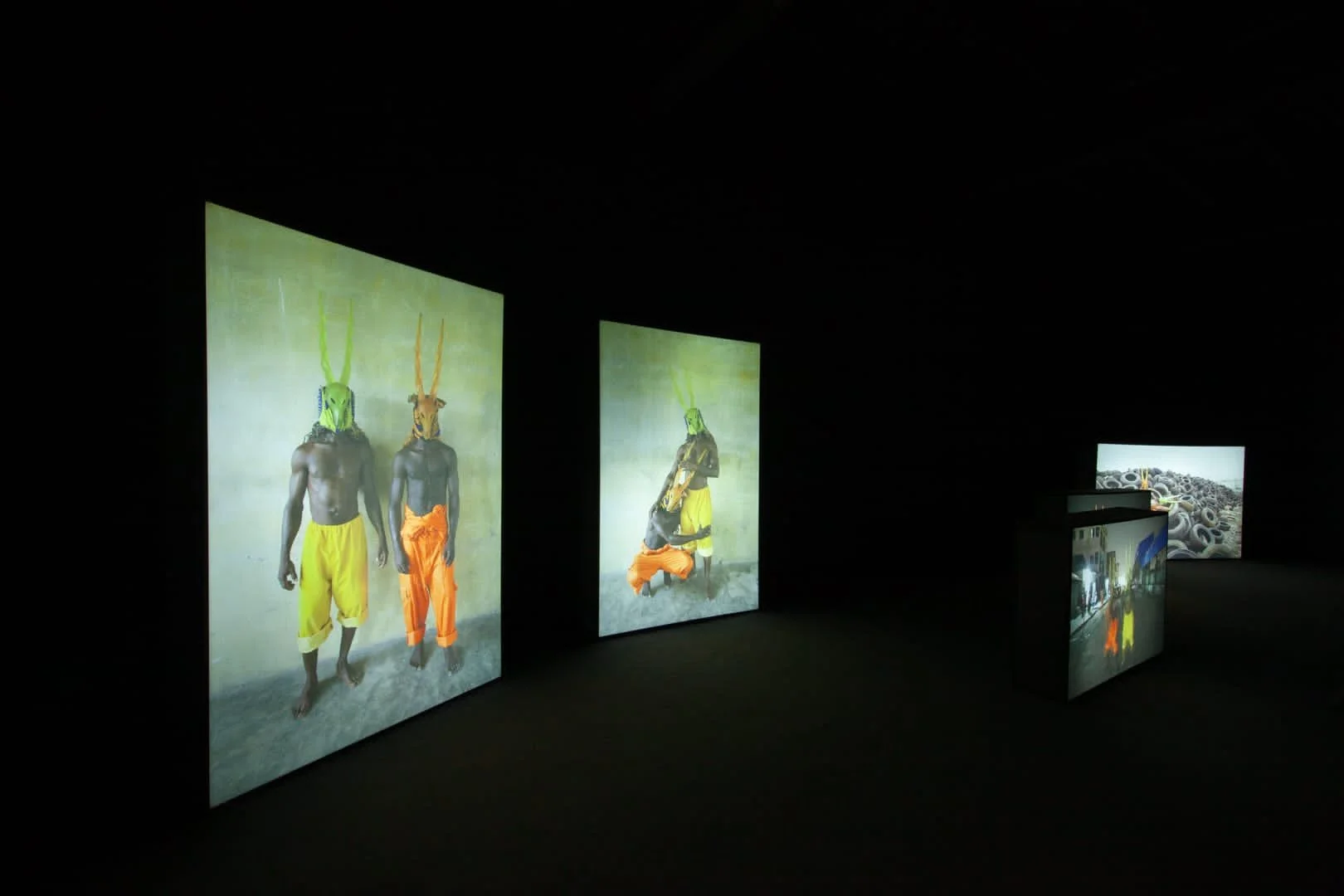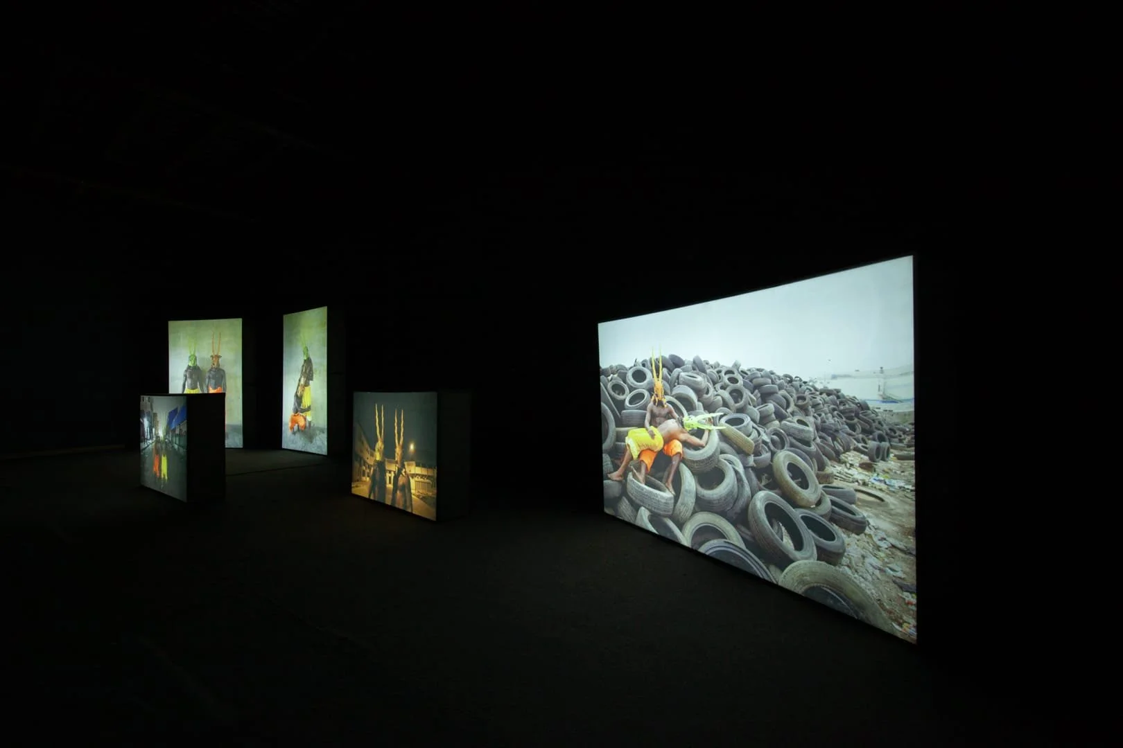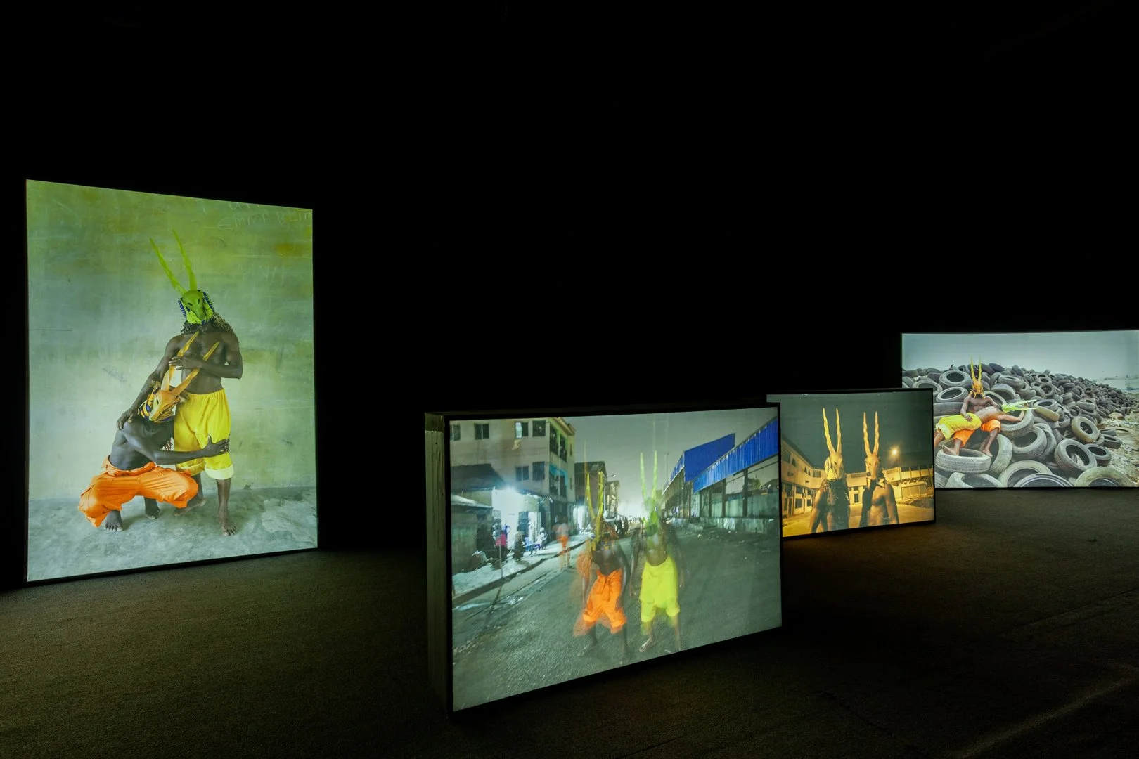 Karikpo: Holy Star Boyz is a continuation of Zina Saro-Wiwa’s exploration into the world of masquerade in the Niger Delta, specifically the antelope-inspired Karikpo masquerade that is unique to the Ogoni people. In this series of lightboxes, Saro-Wiwa has reinvented the mask and used them as motifs to express a range of personal emotions and socio-political questions. Her first work utilising masquerade Karikpo Pipeline - a five-channel video - transposed the boyish, athletic and acrobatic performance of the masquerade onto remnants of the oil industry dotted around the Ogoniland landscape. This new series of lightbox works express the ways the industry has impacted and transformed social performances and is a meditation on hybridity and alienation. Although the masks themselves are cast from an actual traditional karikpo mask, these new breeds are made of a petroleum-based resin. And whilst they appear translucent they are far heavier than their wooden predecessor and do not allow for the acrobatic performance that is traditional for Karikpo dancers. The color of the masks reference the colors worn by industrial labourers and penal dwellers in the Niger Delta and around the world. The series was most recently shown at the 2023 Kochi Biennale in India.